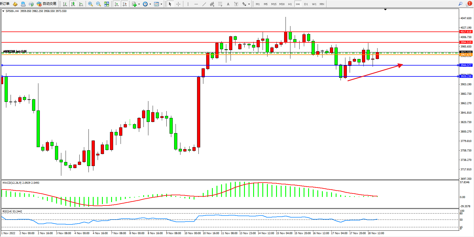 标普SP500——4小时K线图显示:
