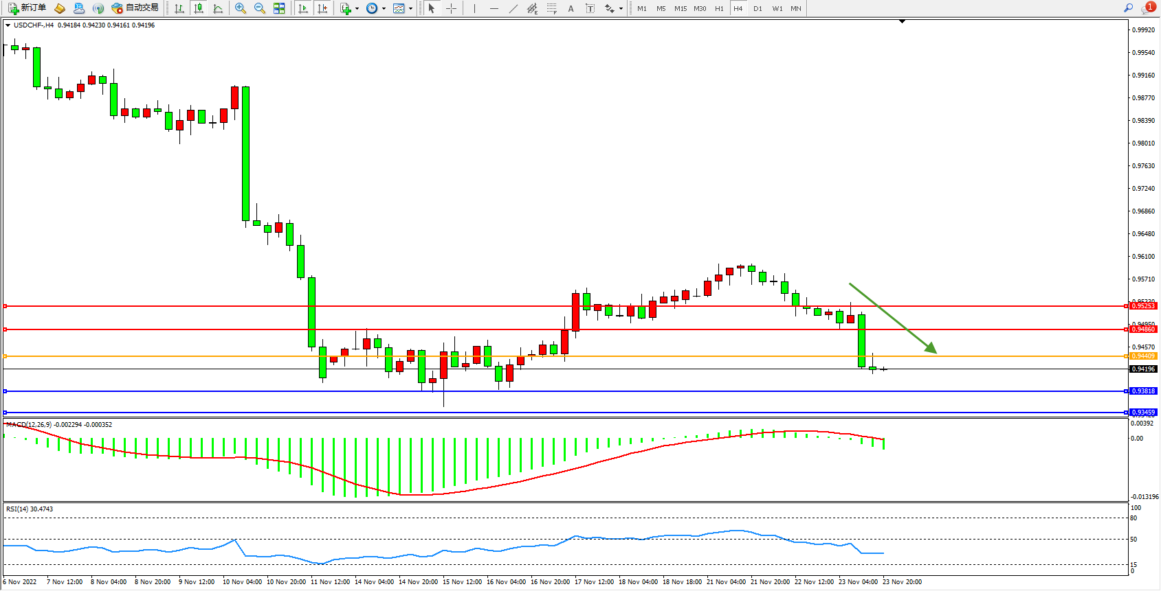 美元瑞郎USDCHF——4小时K线图显示: