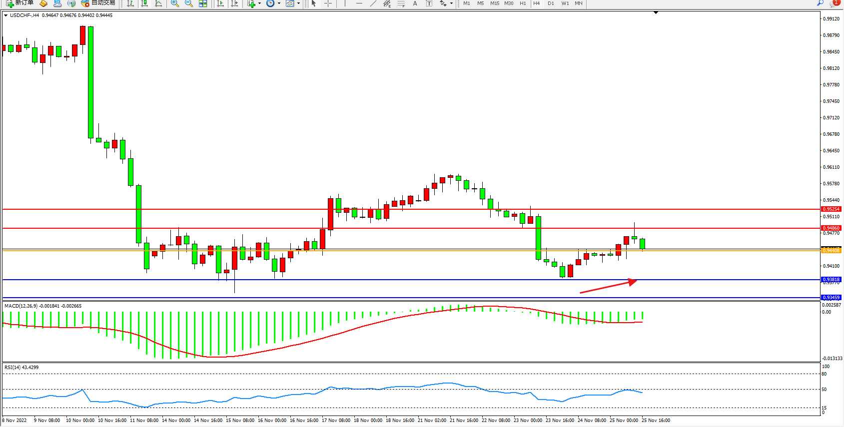 美元瑞郎USDCHF——4小时K线图显示: