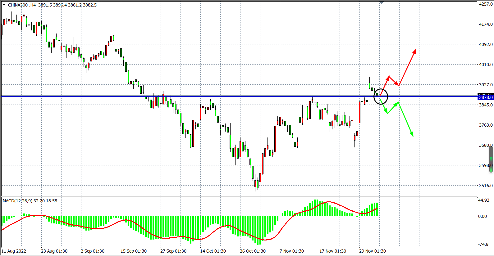 4小时图看,沪深3000再度高开低走,但仍在3880支撑之上运行,MACD量能柱在零轴之上持续放量,日内在3880之上有望延续涨势,上方关注关注4000关口附近,上破看至更高。