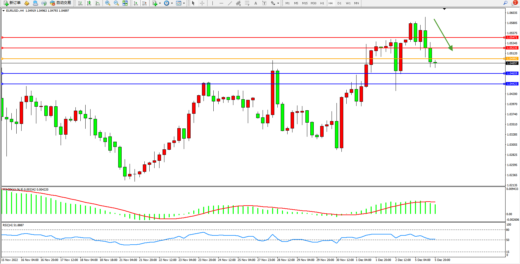 交易策略:1.04992下方看跌,目标1.04659、1.04423