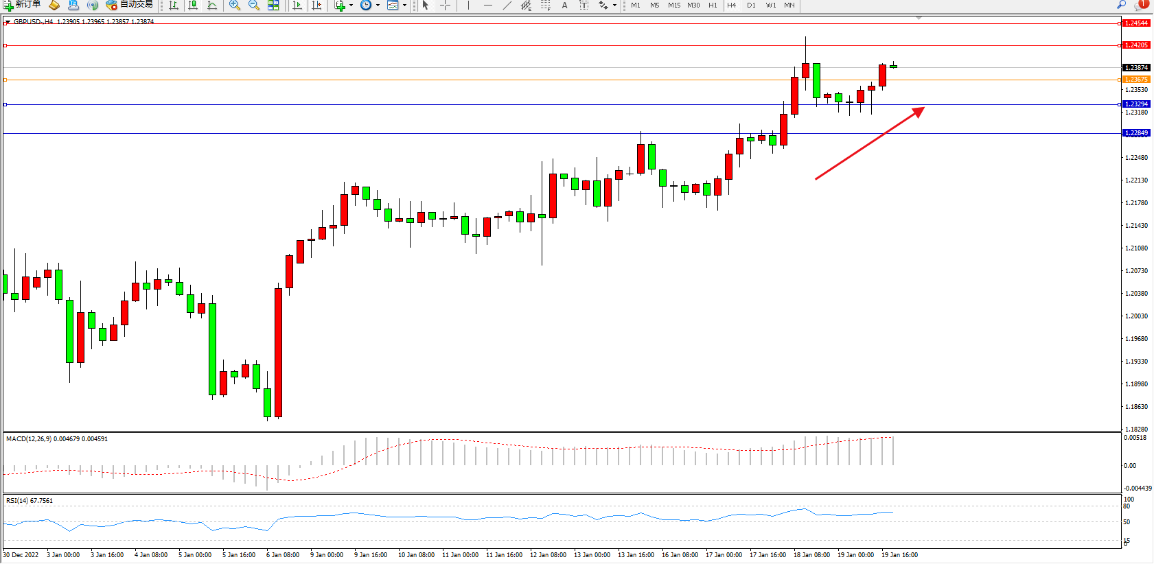 英镑兑美元维持1.23874附近震荡,市场认为在将于2月2日举行的下一次会议上加息50个基点的可能性为82%。受该预期刺激,英镑兑美元多头近期跃跃欲试。