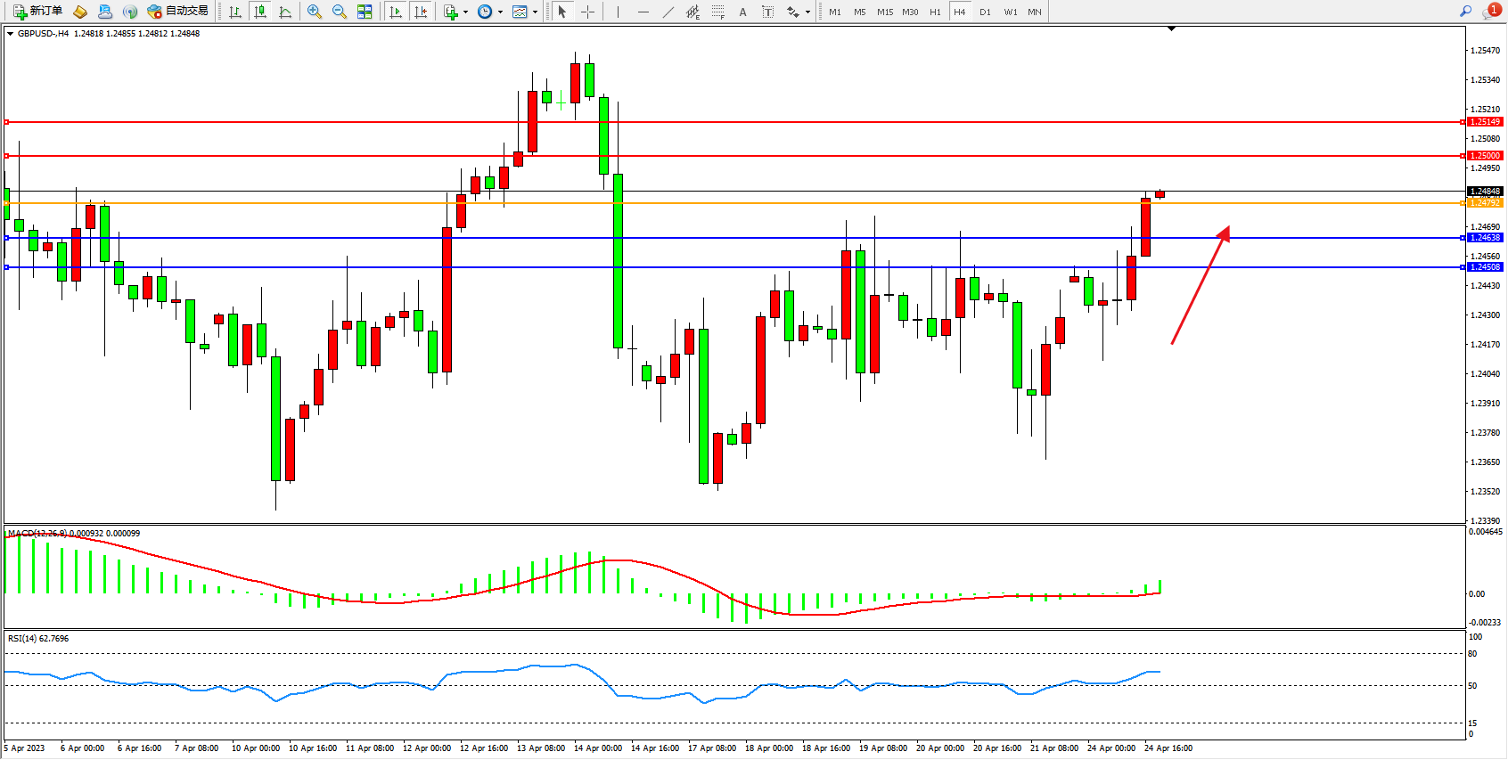交易策略:1.24792上方看涨,目标1.25000  1.25149