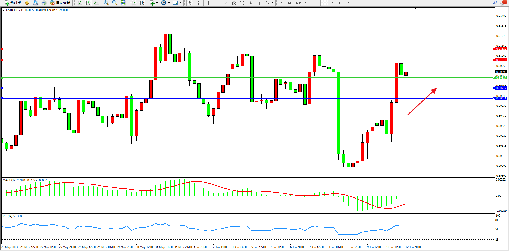 美元瑞郎USDCHF——4小时K线图显示: