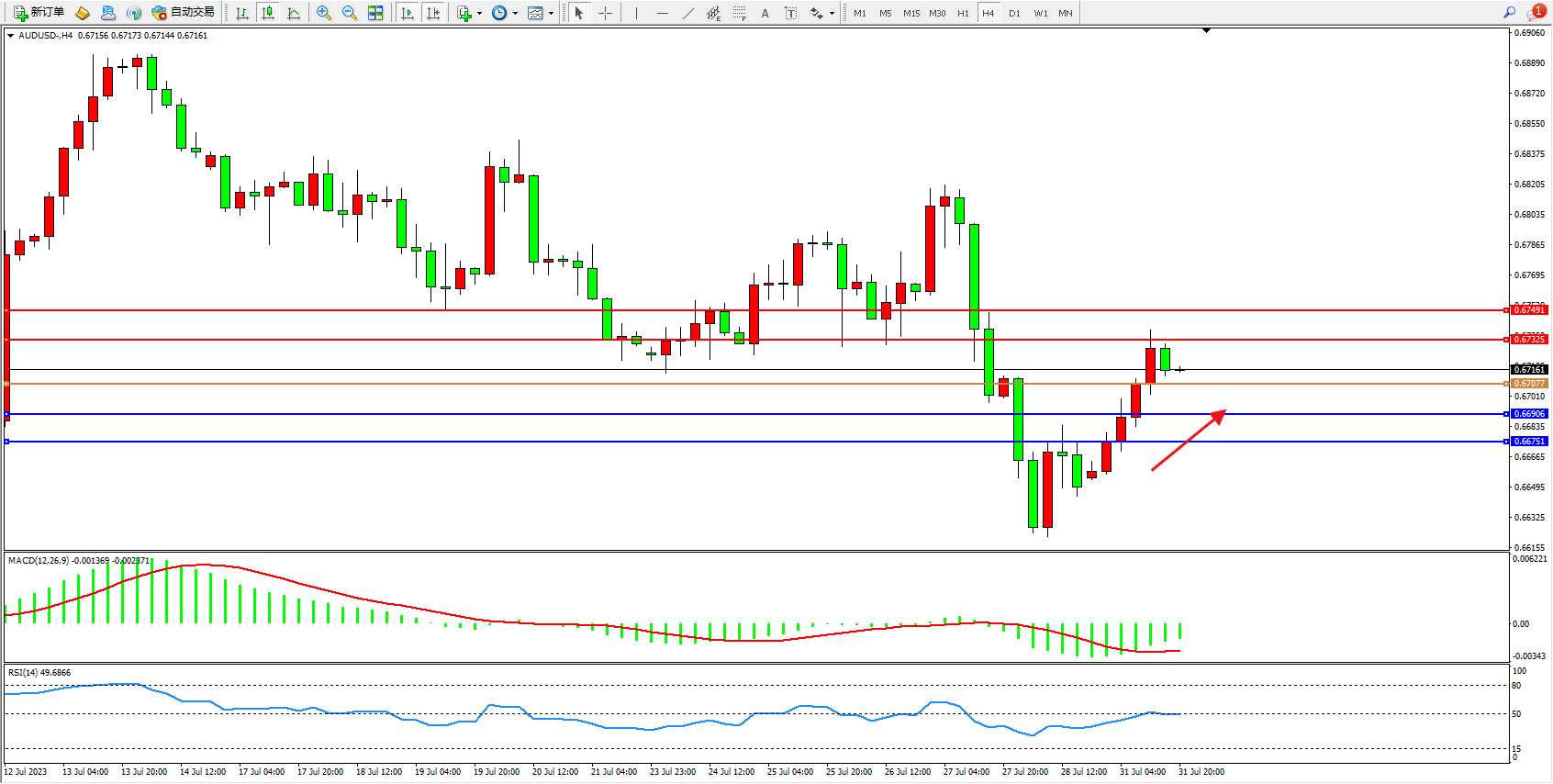 交易策略:0.67077上方看涨,目标0.67325  0.67491
