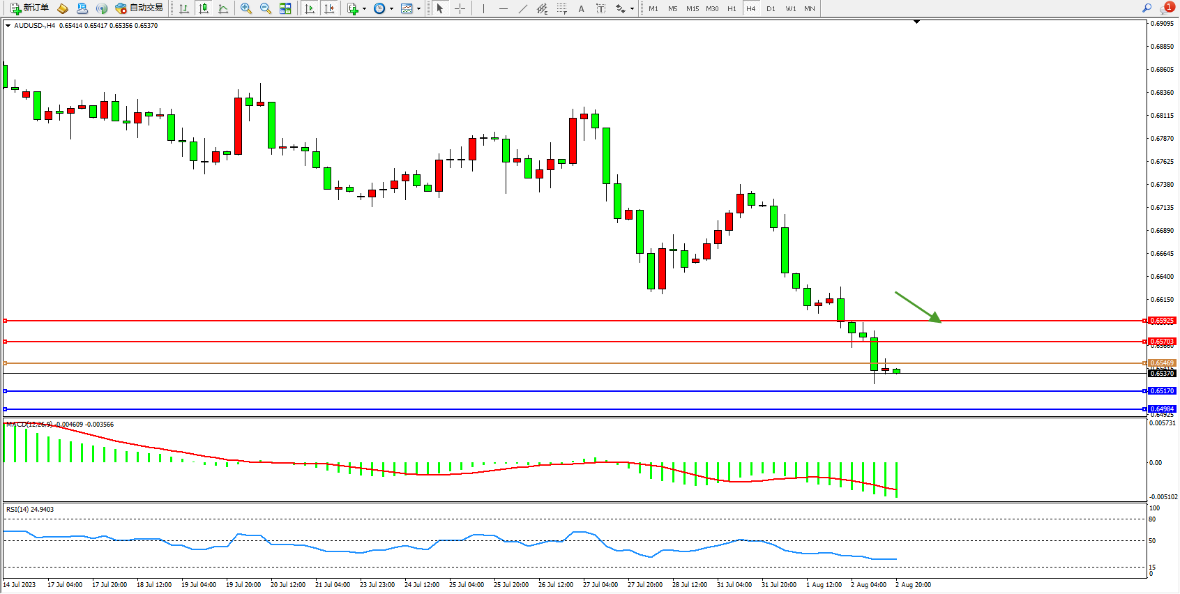 澳元美元AUDUSD——4小时K线图显示: