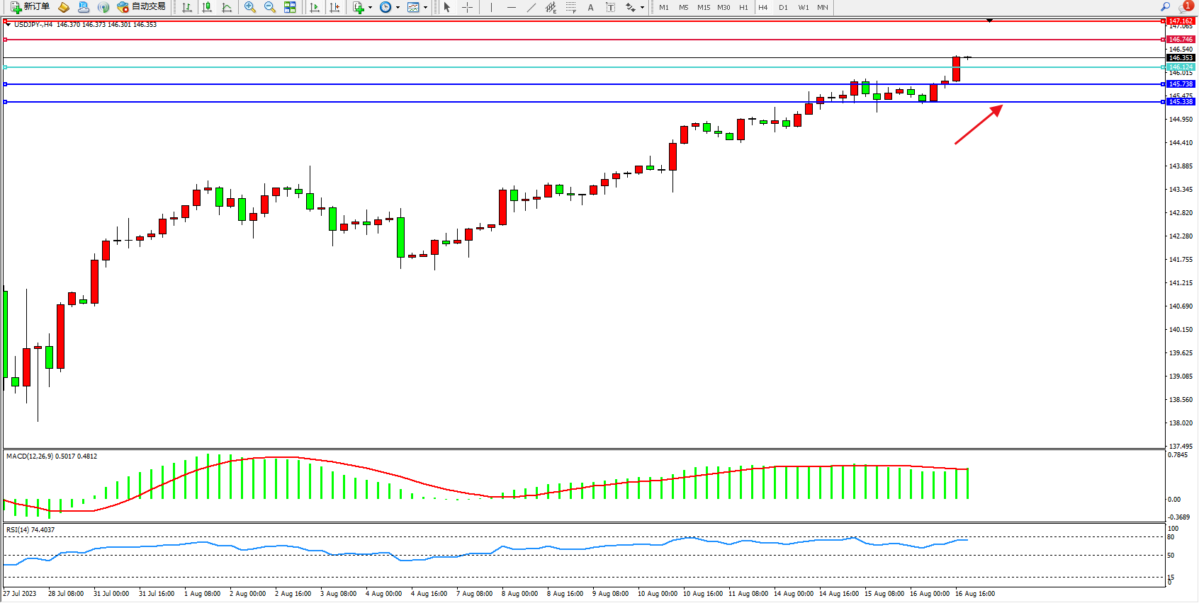 交易策略:146.124上方看涨,目标146.746 147.162