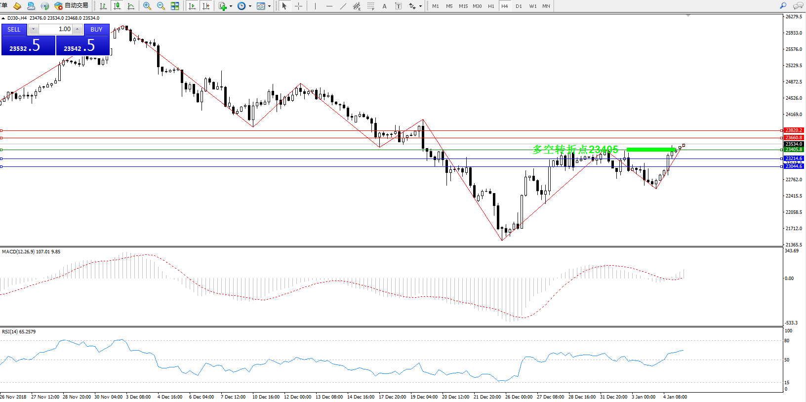 道琼斯指数DJ30—— 4小时K线图显示:
