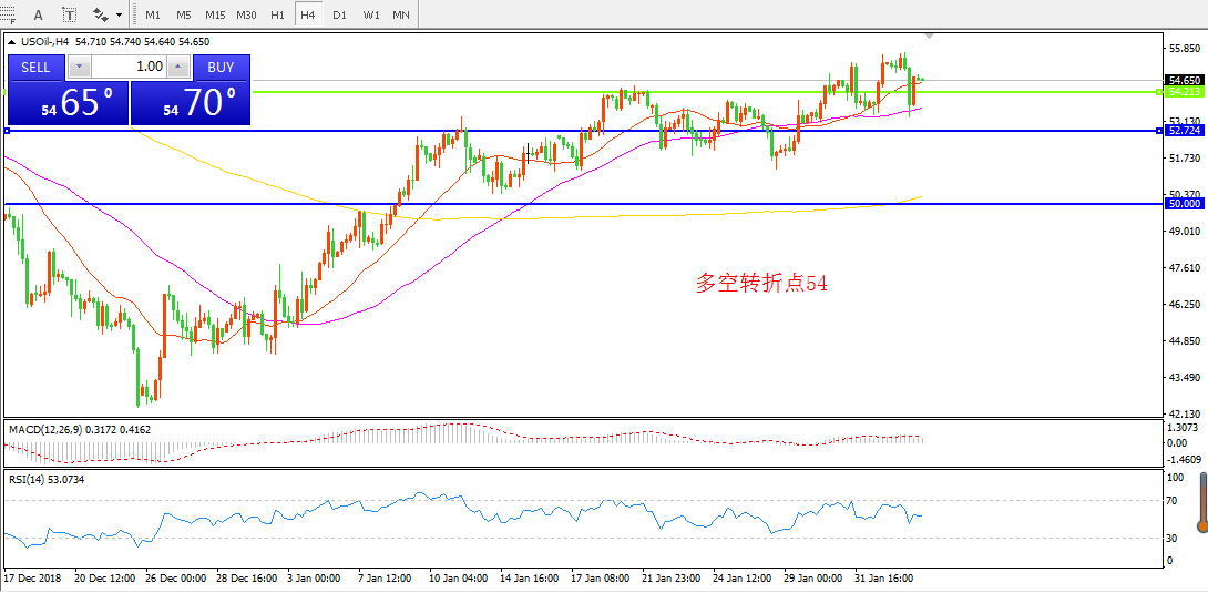 4小时图看,油价强势突破55美金后震荡回落,但整体价格依然处于均线支撑之上。, MACD红柱缩减,短期内依然维持多头思路。