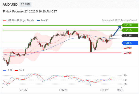 在 0.7095 之上,看涨,目标价位为 0.7135 ,然后为 0.7150 。