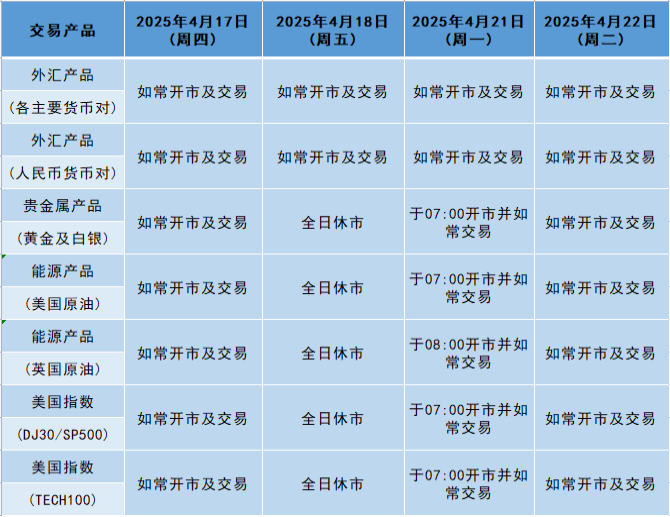 因应2025年4月18日(周五)为美国市场假期(复活节假期),本公司以下产品的交易时间将于假期期间作以下安排,敬请留意。