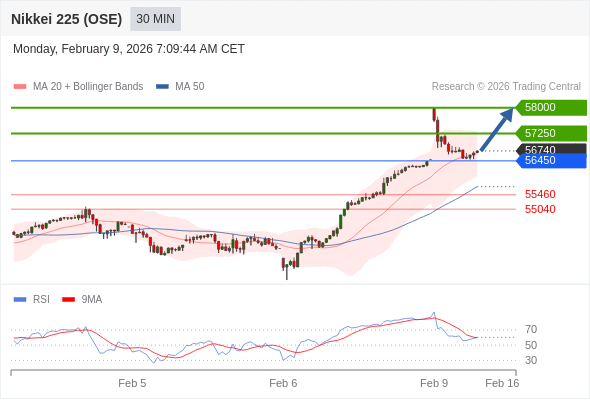 日经225股指期货 (OSE) 当日内: 在56450之上,看涨。