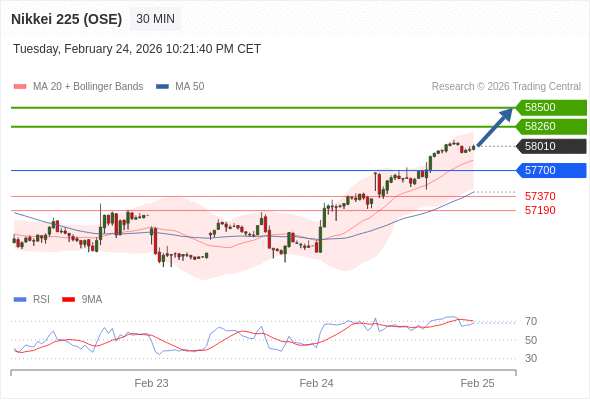 日经225股指期货 (OSE) 当日内: 在57700之上,看涨。
