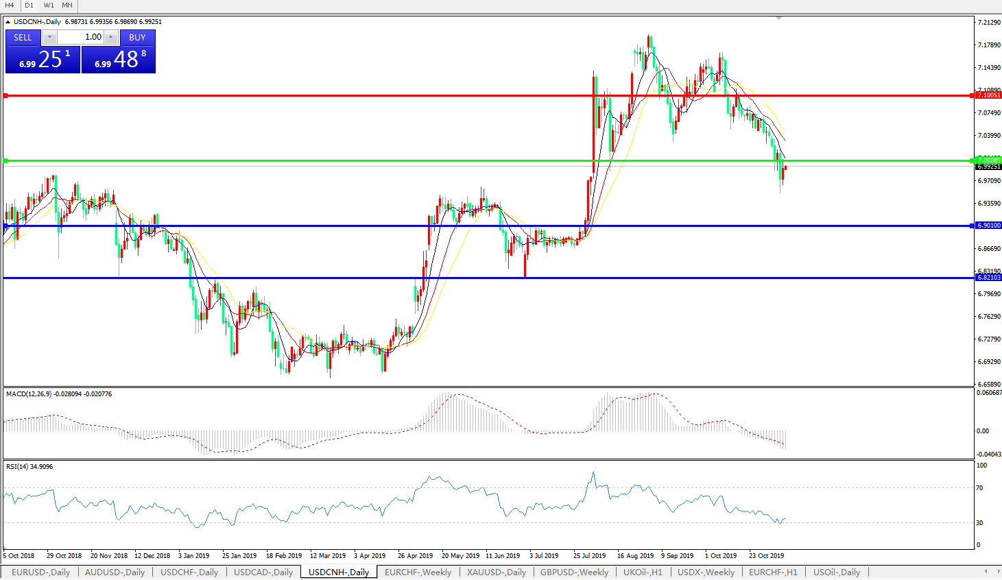 交易策略: 在7.0000之下,看跌,目标价位为6.9010,然后为6.8210。