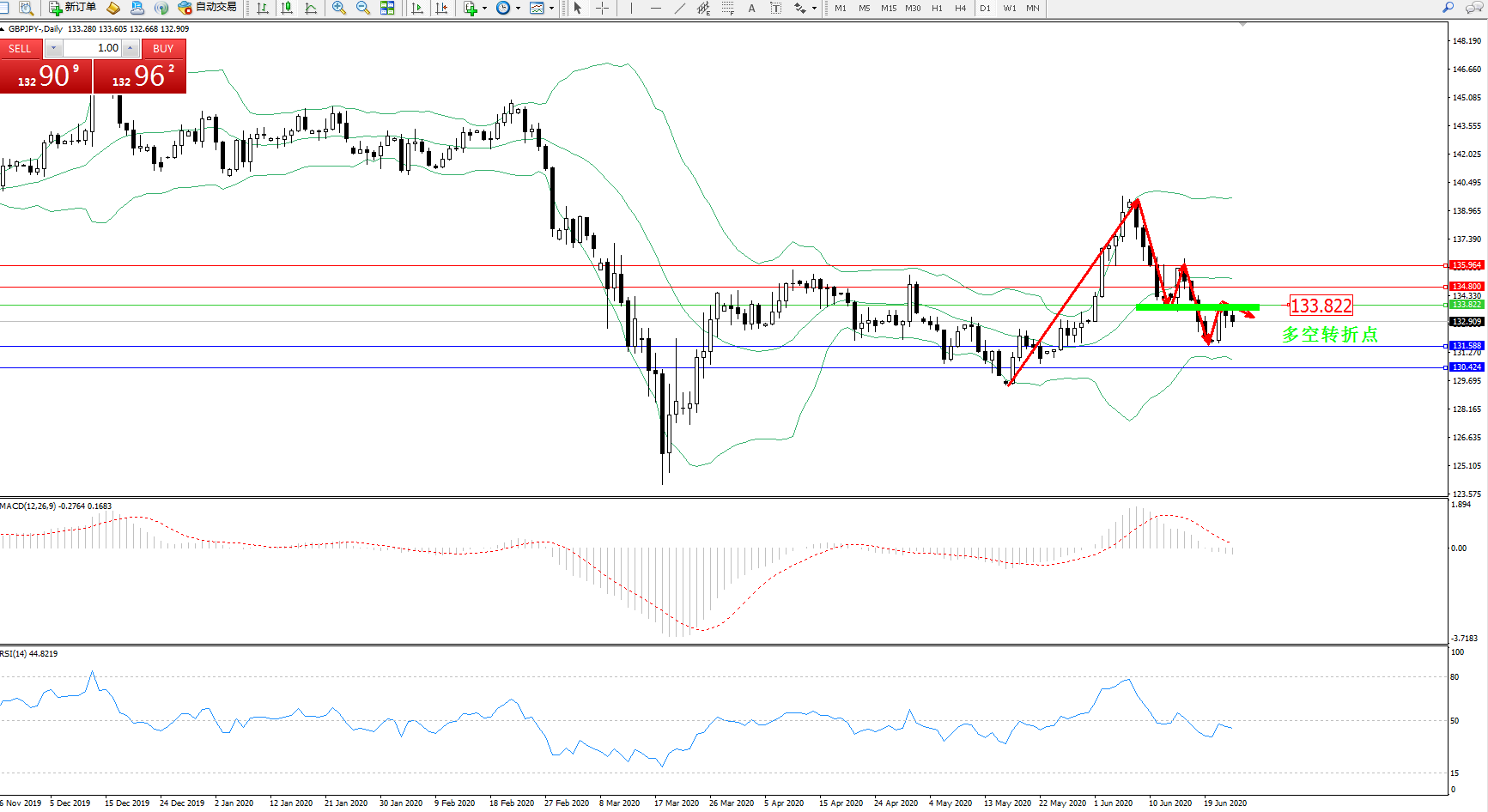 交易策略:133.822下方看跌,目标131.588、130.424