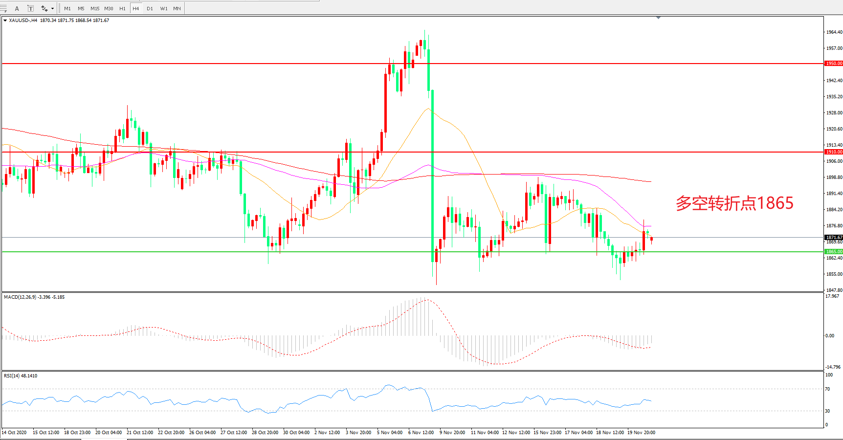 上周,随着疫苗研发进展顺利的消息不断出炉,投资者对经济复苏的信心正在恢复,加上投资者对经济恢复预期升温,市场风险偏高有所提升,给金价短线走势带来沉重的压力,现货黄金上周五小幅反弹,但全周仍累计下跌近17美金,收报1873.55美元/盎司。
