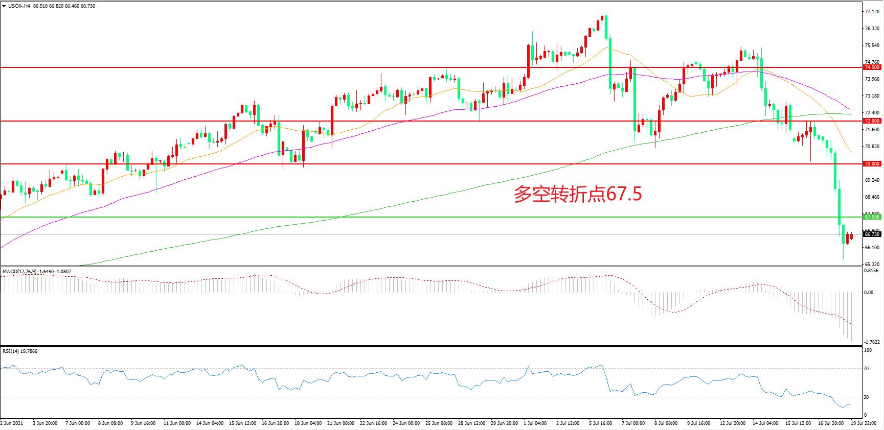 周一(7月19日),由于市场普遍怀疑新冠Delta变种病毒的爆发会延缓全球经济复苏势头,恐慌情绪骤然升温,且OPEC+达成逐月增产的协议,并将并将沙特、阿联酋、俄罗斯和伊拉克的产油基准均上调导致油价“闪崩”,美国WTI原油“崩跌”逾8%,收报66.79美元/桶,如果新冠疫情回潮激起了的避险情绪继续高涨,油价可能会出现进一步下跌。