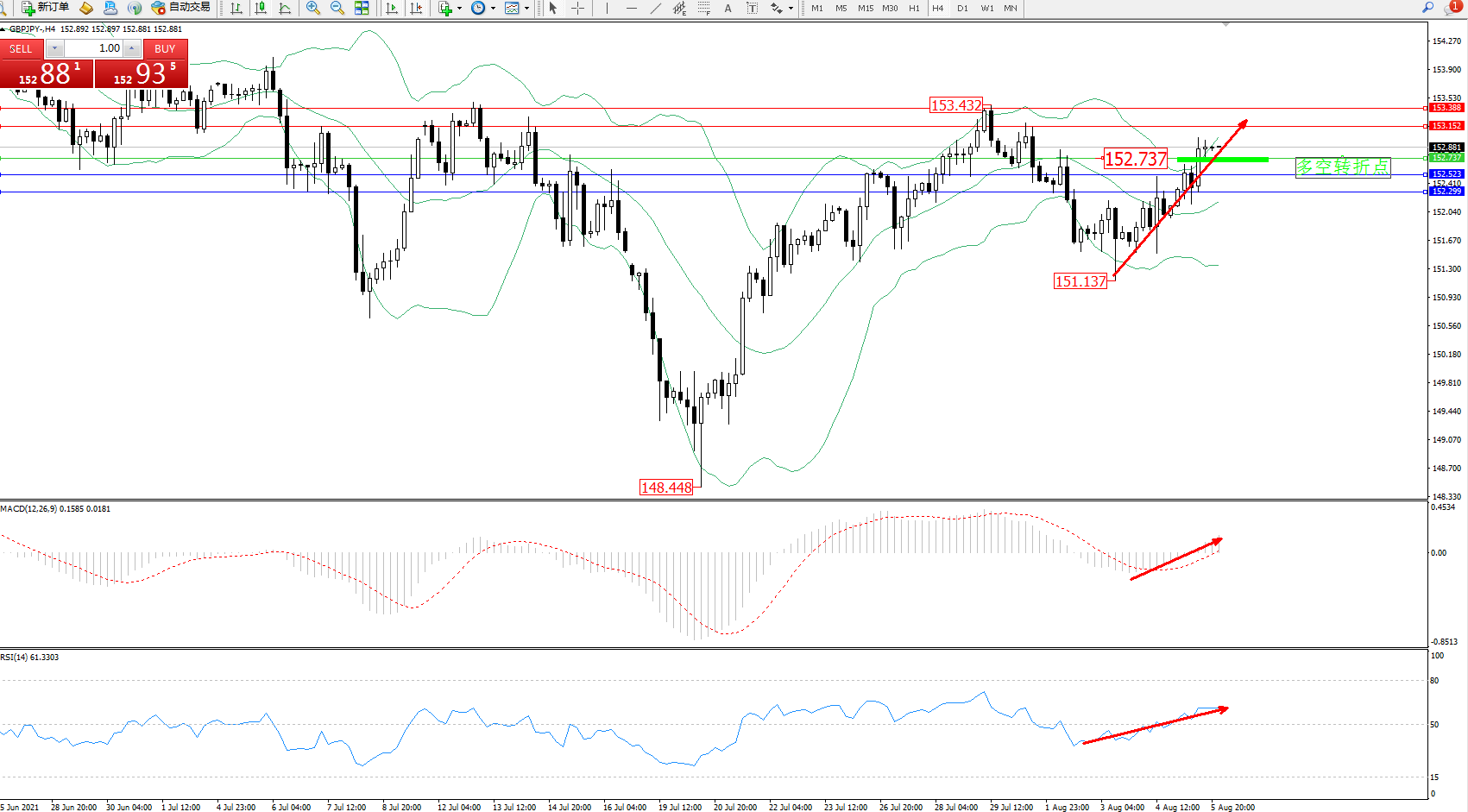 交易策略:152.737上方看涨,目标153.152、153.388