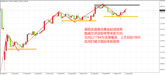 鉴于近期怀俄明州提顿县的疫情风险水平升高,原计划在线下举行的2021杰克逊霍尔研讨会将在8月27日改为线上进行。今年会议的主题是“不平衡经济中的宏观政策 ”,美联储主席鲍威尔将于北京时间27日晚上10点发表主题为“经济前景”的讲话。根据过往经验预计,美联储届时可能给出缩减购债的线索。理论而言,若美元弱,则黄金强,若美元强,则黄金弱。