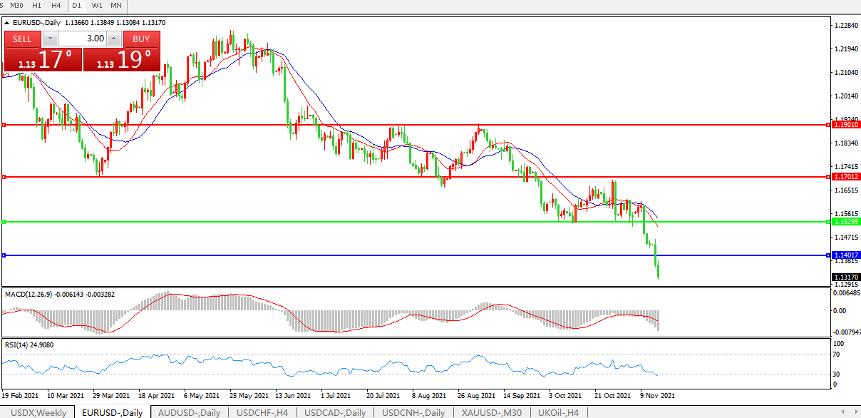 技术面简析:日图均线呈空头排列,汇价大跌后稍微止跌,MACD运行于0轴下且量能放量,RSI有止跌迹象 ,预计短期汇价大概率将在反弹后进一步下行。