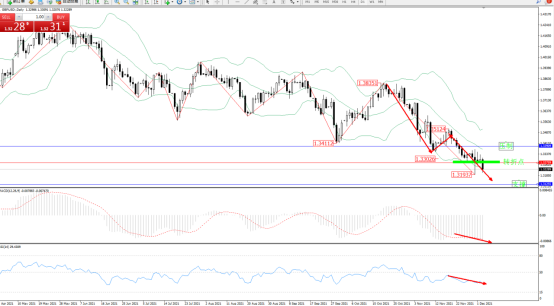 空头动力延续布林带指标通道中下轨区间持续震荡下行,布林带指标呈收口向下移动态势良好,此前低位1.31937位置近在咫尺破位在即,上方压制关注1.33909附近,低位支撑关注1.31255附近,关注1.32759附近转折点,MACD指标处于空头区域低位整理平移,RSI指标处于空头区域维持弱势徘徊中,如图: