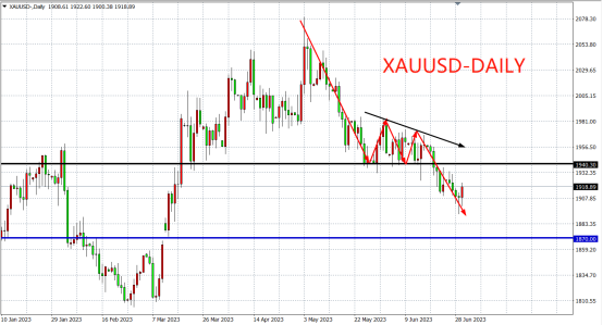 周三(6月28日)鲍威尔重申鹰派立场,称今年有必要再加息两次,不排除连续加息,受累于此现货黄金日内大幅下挫,跌破1910关口并触及近4个月来新低,最终收跌0.32%。