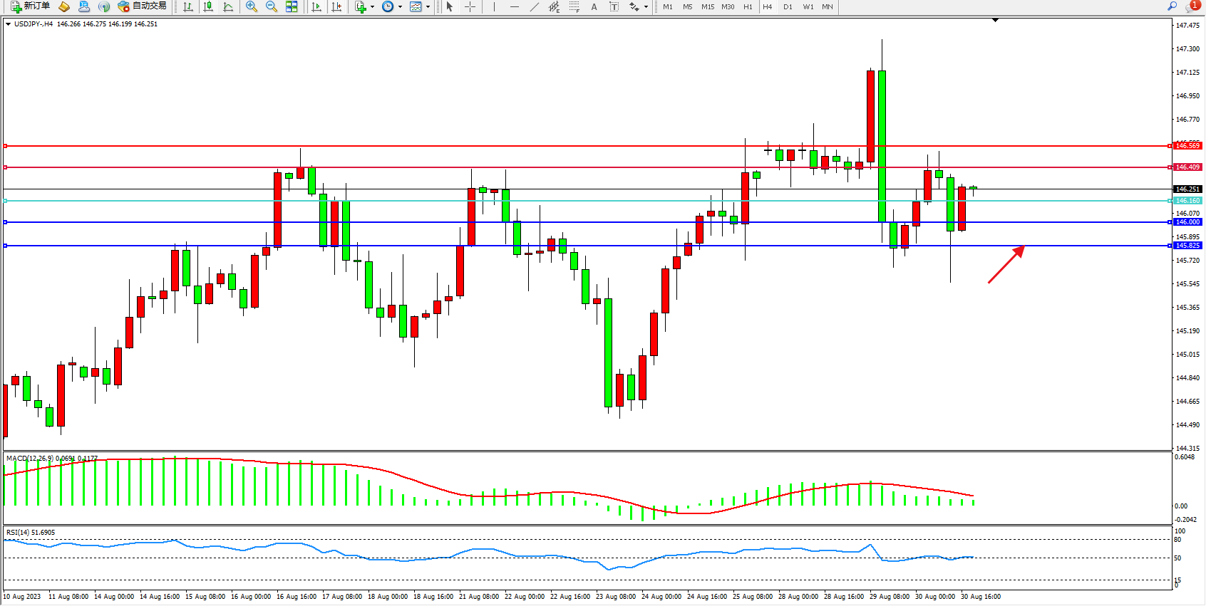 备选策略:146.160下方看跌,目标146.000  145.825